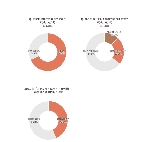 また、2025年にファミリーマートで実施した「ファミリ~にゃ~ト大作戦!」の展開商品を購入した実績のある人に絞ると、購入者のうち56.2%がねこを飼ったことがない層で、飼育経験者(43.8%)を上回りました。特に「飼育経験はないがねこが好き」という層は全体の37.7%を占めており、事情により飼えない人を含む“ねこ関心層”が、ねこの日商戦を支える重要な存在であることがうかがえます。