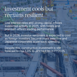 投資市場ではホテルとオフィスが引き続き堅調で、東京CBDではグレードAオフィスの賃料がバブル期水準に迫るなど強い需要が継続しました。一方で、物流施設など新築大型案件の減速や、金融審査の厳格化を背景に、投資はリファービッシュや特殊用途施設など価値創出型へシフトしています。