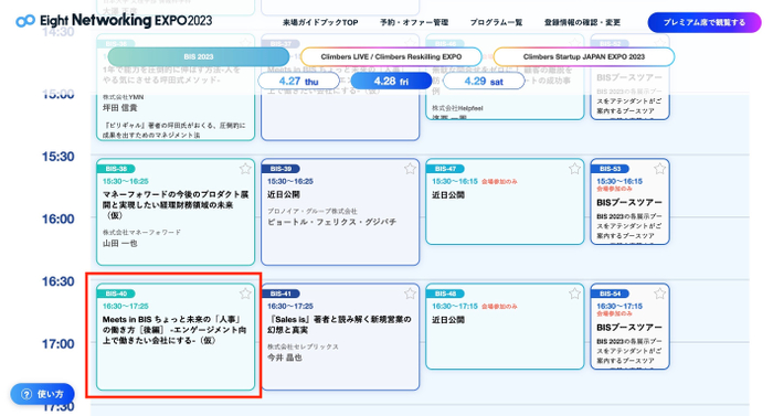 タイムテーブル内で「4/28」を選択、16:30〜の【BIS-40:Meets in BIS ちょっと未来の「人事」の働き方[後編]】を選択し、座席予約。