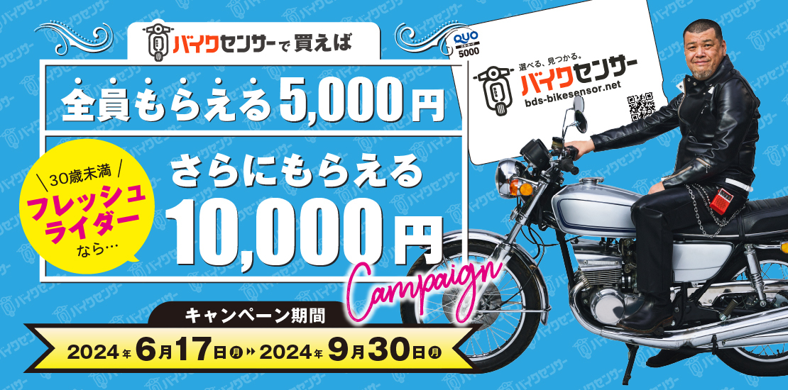 本キャンペーンでは、期間中にBDSバイクセンサーで車両見積りや在庫確認などのお問い合わせを行い、そのお問い合わせ車両をご成約、キャンペーンのエントリーをしていただいた方全員に、もれなく5千円分のQUOカードをプレゼントいたします。さらに、30歳未満の方は1万円分のQUOカードを追加し、合計1万5千円分プレゼント!バイクの購入を検討されている方は、ぜひとも「BDSバイクセンサー」でバイクを探してみてください。