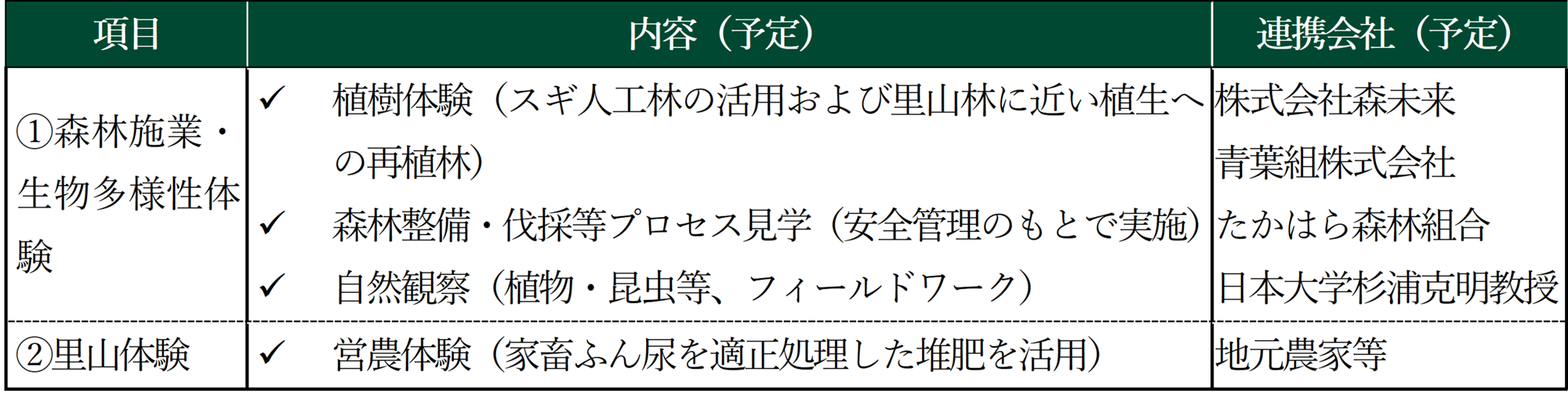 ①植樹体験、森林整備・伐採等のプロセス見学、自然観察の現地実装は、青葉組株式会社(本社:東京都千代田区、代表取締役:中井照大郎)、たかはら森林組合(栃木県矢板市、代表理事組合長:佐野幸隆)、学術的知見として、日本大学生物資源科学部の杉浦克明教授が参画予定です。