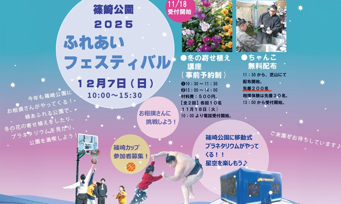 その他にも、ちゃんこの無料配布、3×3ストリートバスケット大会開催、プラネタリウム、冬の花の寄せ植え講座や、ハーブリース作り、公園のはたらく車など、イベント盛りだくさんです。