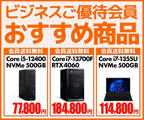 ビジネスご優待会員様向けに『ビジネスご優待会員 おすすめ商品』を実施中です。担当スタッフがおすすめするパソコン、中古商品、PCパーツ・周辺機器をズバリ価格でご用意しております!この機会にぜひご購入検討ください。