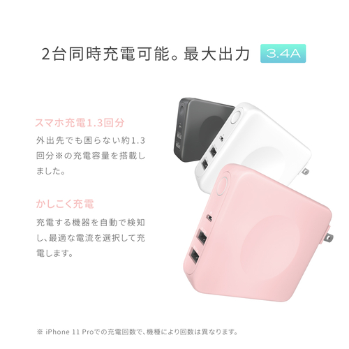 AC充電器としては、最大合計3.4Aの高出力で2台の端末を同時に充電することが可能。