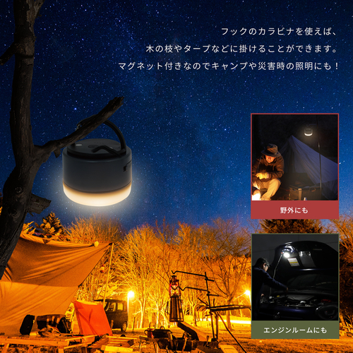 ・マグネットとフックが付いており、テントのフレームに取り付けたり、車に貼り付けたりと、アウトドアでも様々なシーンで使うことができます。