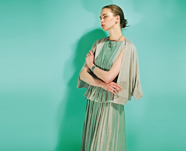 麻を得意とするブランドとして、自然と共存していくことをテーマに服づくりに取り組んでいます。自然のエネルギーや癒しを感じられる心地良い服をつくりたいと考え、麻(ラミー)混の素材に緑を感じるきれいなカラーをプリントした、ブラウスとスカートをつくりました。常に新しい物づくりに挑戦し続ける、日本の職人のプリーツと転写プリントのテクニックにより、麻素材の可能性が広がりました。