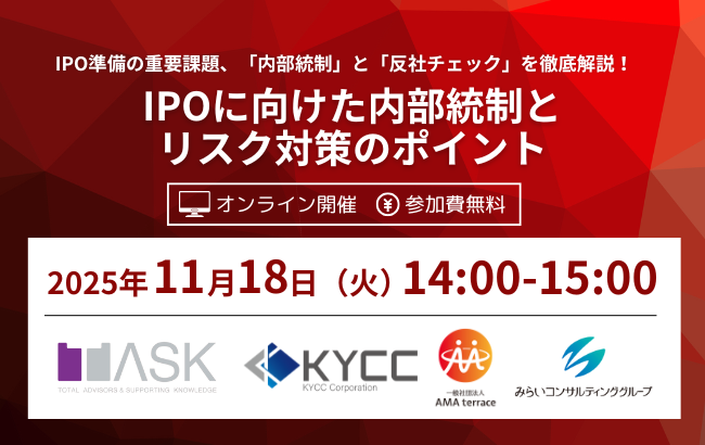 みらいコンサルティンググループ(本社:東京都中央区、代表:久保 光雄 岡⽥ 烈司)は、2025年11月18日にセミナー『IPOに向けた内部統制とリスク対策のポイント』をWEBにて開催します。
