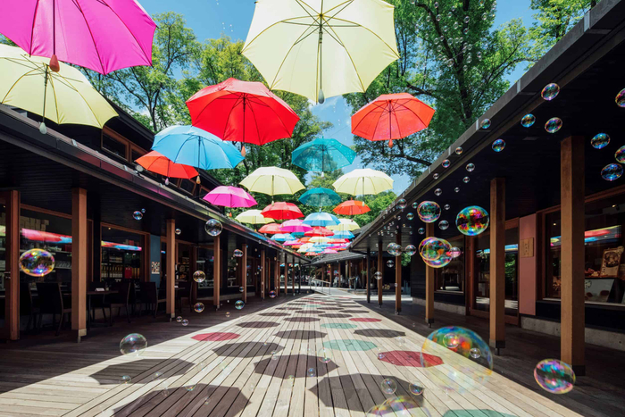 昨年より傘のアーケードに、雨上がりの虹をイメージしたシャボン玉を空に浮かべる時間を設定しました。今年は夜のライトアップの時間帯にもシャボン玉を浮かべる時間を設け、10:00・16:00・20:00の毎日3回、それぞれ数分間シャボン玉が現れます。色とりどりの傘とシャボン玉が重なり合う光景は必見です。