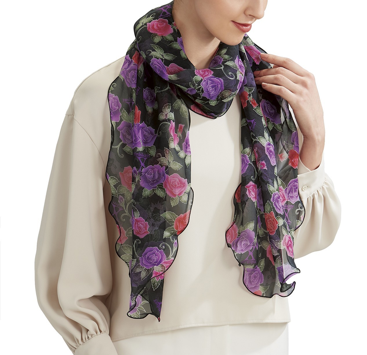 yoshikittyが友禅模様のシルクシフォンのストールに! 「yoshikitty 薔薇の宴 友禅模様の手捺染シルクフォン・ストール」新発売!