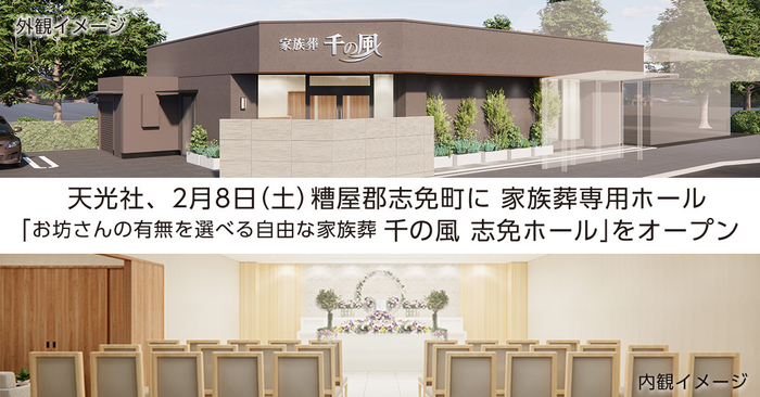 「天光社」ならびに「千の風」「糸」ブランドで葬儀式場を全国展開する、株式会社 天光社(本社:福岡県福岡市、代表取締役社長:江村 哲也、以下 当社)は、2025年2月8日(土)に1日1組貸切の家族葬専用ホール「お坊さんの有無を選べる自由な家族葬 千の風 志免ホール」(以下 志免ホール)を糟屋郡志免町にオープンいたします。