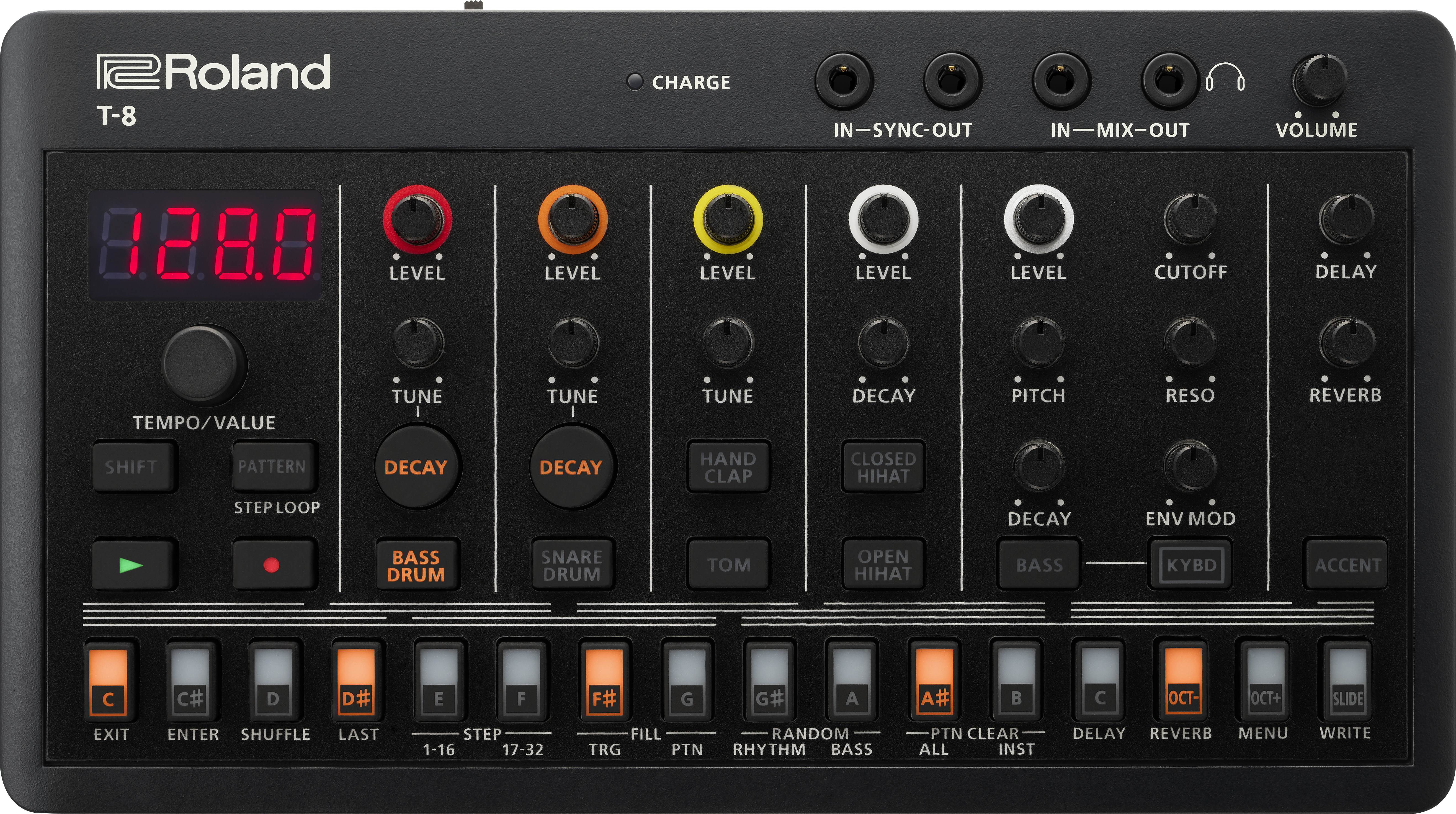 最新のエレクトロニック・ミュージックでも多用される、象徴的なローランドのドラム/ベース・サウンドを、どこにでも持ち運べるコンパクトなボディに搭載。ACB(※)によって忠実に再現された、名器と呼ばれるリズムマシン「TR-808」「TR-909」「TR-606」と、ベース・シンセサイザー「TB-303」のサウンドを組み合わせて楽曲を構築できます。リズムを打ち込むドラム・シーケンサーは、6つトラックを持ち、上記の「TRシリーズ」で採用された「TR-REC」と呼ばれる操作システムを装備。操作を止めずにアイデアを形にできます。さらに、「ステップ・ループ」、「パターン・シフト」、「プロバビリティ」などのさまざまな内蔵ツールを駆使することで、ダイナミックなパフォーマンスを実現します。また、『T-8』は、「TB-303」から受け継いだノコギリ波・矩形波と操作性で、特徴的なベース・サウンドを直感的に調整・加工できます。