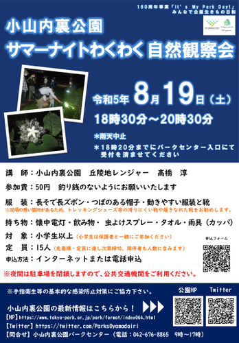 ※小雨決行、雨天中止:中止の場合は、当日16:00以降に公園Twitter(@ParksOyamadairi)、申込方法に応じて、電話もしくは メールアドレスへの返信にてお知らせします。