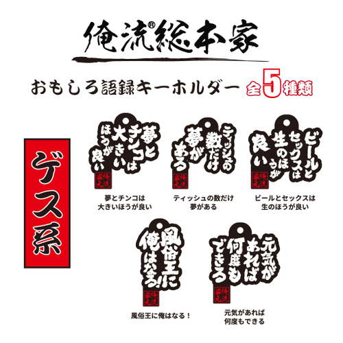 株式会社太陽(所在地:千葉県匝瑳市飯倉台28-11、代表者:片岡正徳)は、個性を表現する「おもしろTシャツの俺流総本家」ブランドより、2024年9月20日、シリーズ累計販売4万枚を突破した俺流総本家の人気商品「おもしろ語録Tシャツ」のデザインをあしらった【新商品】「おもしろ語録キーホルダー」を、俺流総本家オンラインサイトにて400円(税込)で発売いたします。