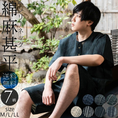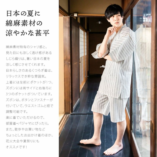 ベーシックな縞や格子で、変わり織の風合いがあるため奥行きも感じさせる綿麻甚平。綿85%、麻15%の綿麻素材だから、さらりと軽い着心地で夏から秋にかけての季節にぴったりです。上下合わせて4つのポケットがあり機能性は抜群。部屋着として使うもよし、ちょっとした買い物などの外出着に使うもよしと、夏に大活躍する一着。11柄でS~4Lまでとバリエーション豊富なのも嬉しい。