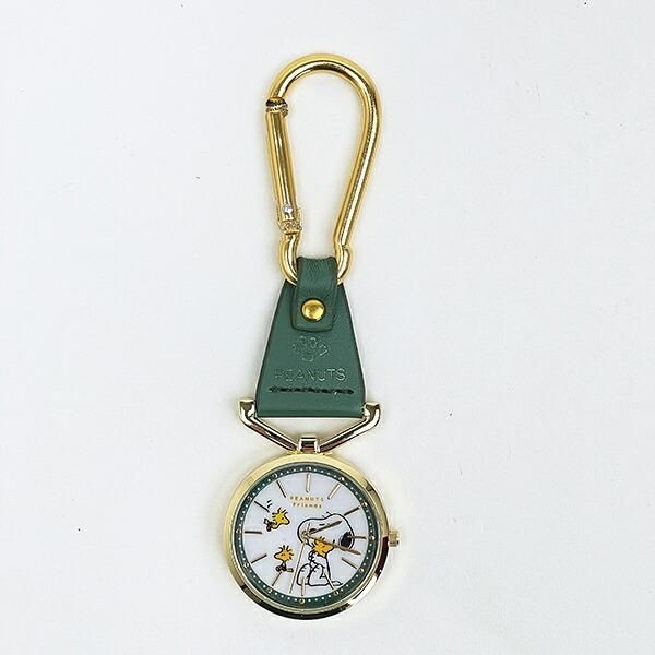 かばんやベルトに付けやすいカラビナタイプの時計です。時計のところになんとも愛らしスヌーピーとウッドストックがデザインされています。かわいらしいのに、ゴールドの部分もあり、高級さと上品さを感じる見た目です。