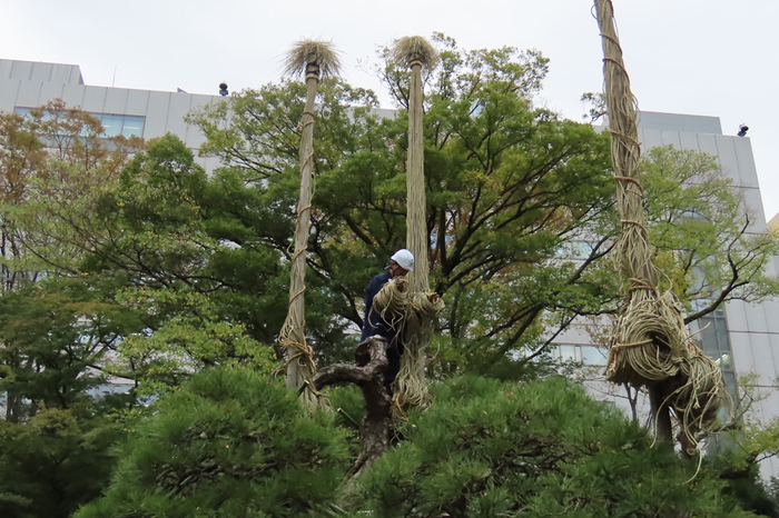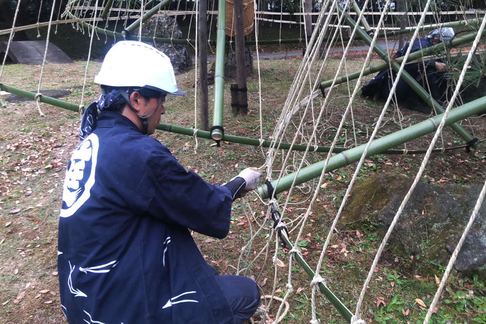 当日は園内の松に冬支度を施していく様子をご覧いただける他、雪吊りの役割や、竹や縄を巧みに取り付けていく伝統の技を解説付きで実演します。