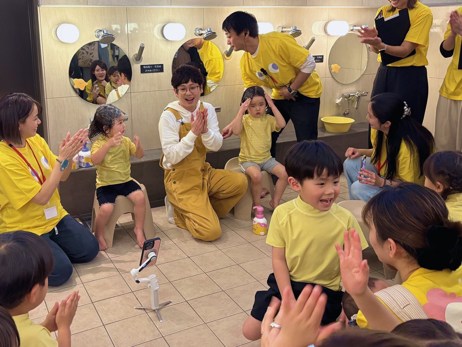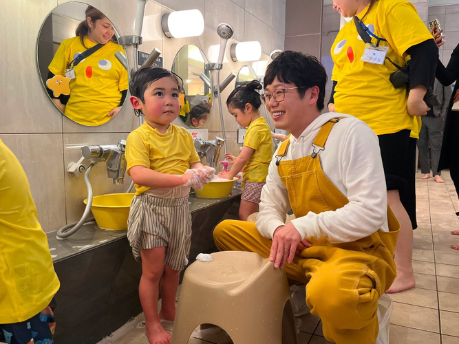お風呂の日(2月6日)を前に、銭湯を貸し切り、キッズ親子27組が大集合!新商品を一足先に体験し、木下ゆーきさんと“じぶん洗い”に挑戦