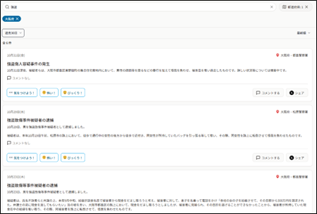 当サービスは、全国の警察が日々ウェブサイトで公表している「今日の事故・事件・犯罪」を、AI 技術を使ってタイムリーかつ網羅的に収集し、日々レポートします。収集された情報は、都道府県、期間、キーワードを指定すること等により見つけやすくしています。消費者・市民のみなさまに対し統計表やグラフでは感じ取れない事件・犯罪のリアルさを速報的に伝え、事故や犯罪への「危険感受性」を上げることに貢献します。