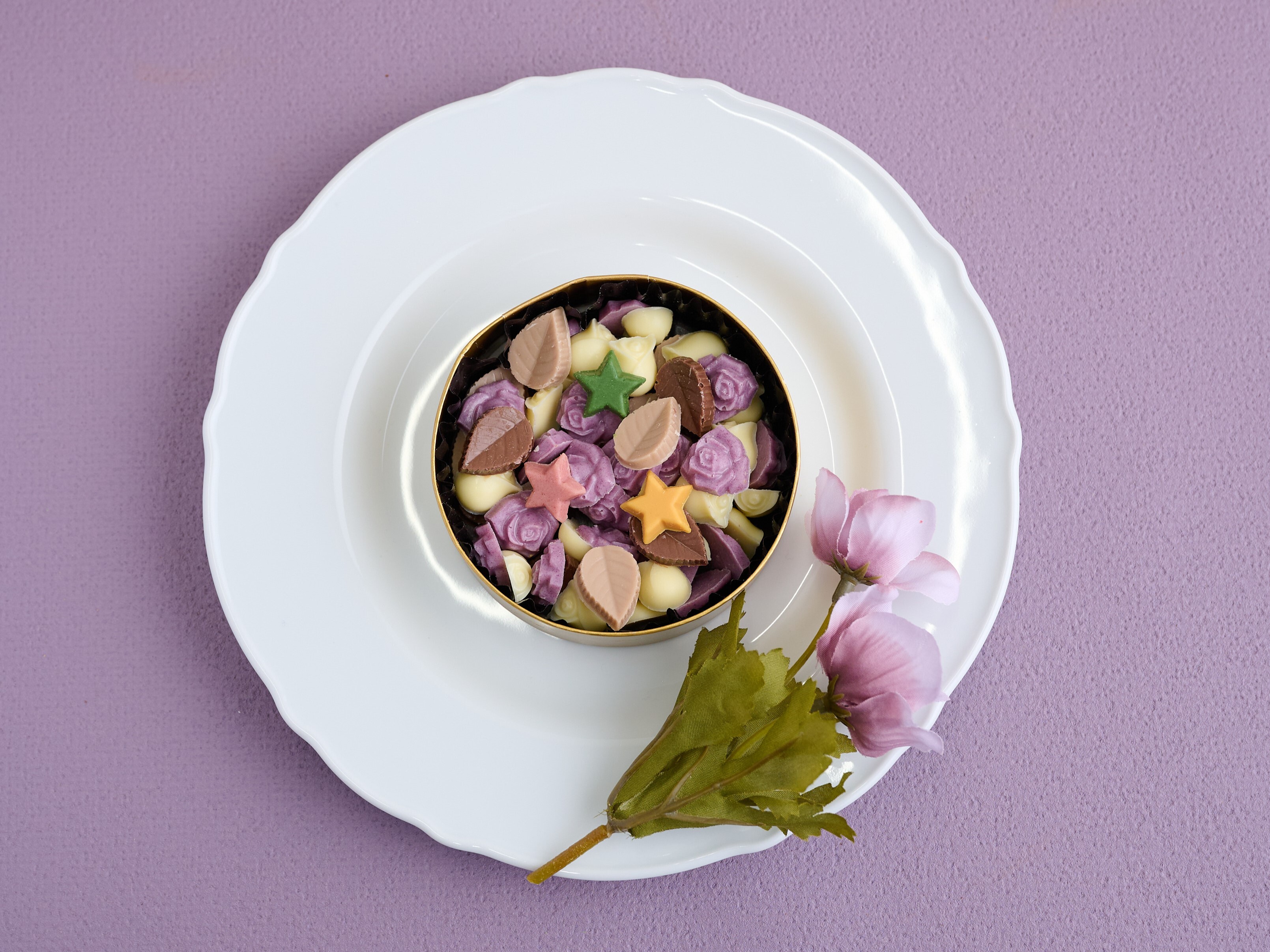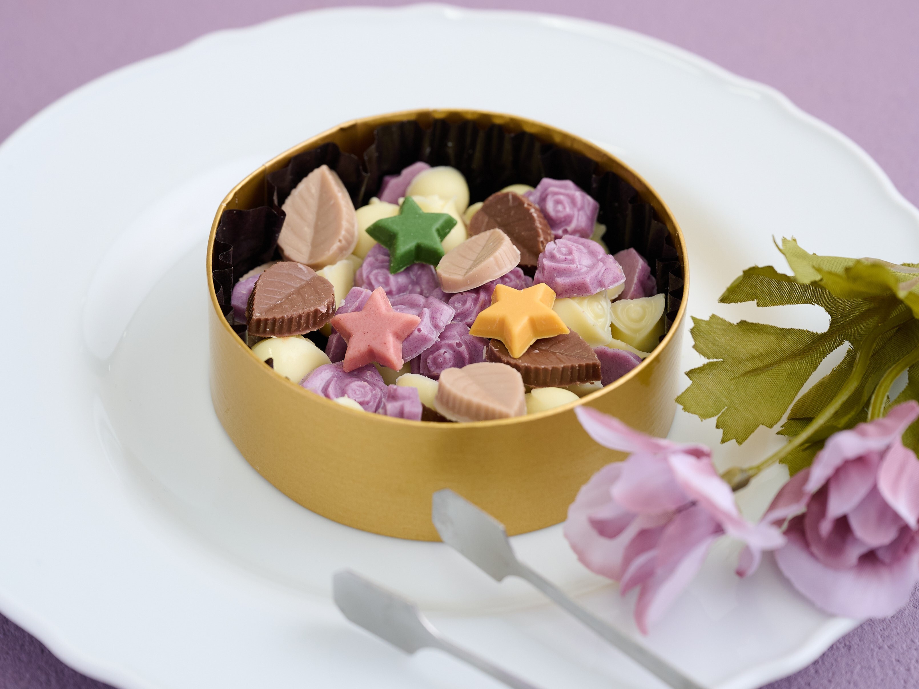 紫芋チョコとホワイトチョコをメインに、ミルクとマロンのリーフで落ち葉の風景を、そして、秋風に揺れる紅葉をイチゴ、みかん、抹茶の星型チョコで表現しました。蓋を開けると、豊かなフレーバーと共に秋の訪れを感じられる一口サイズのショコラアソートです。