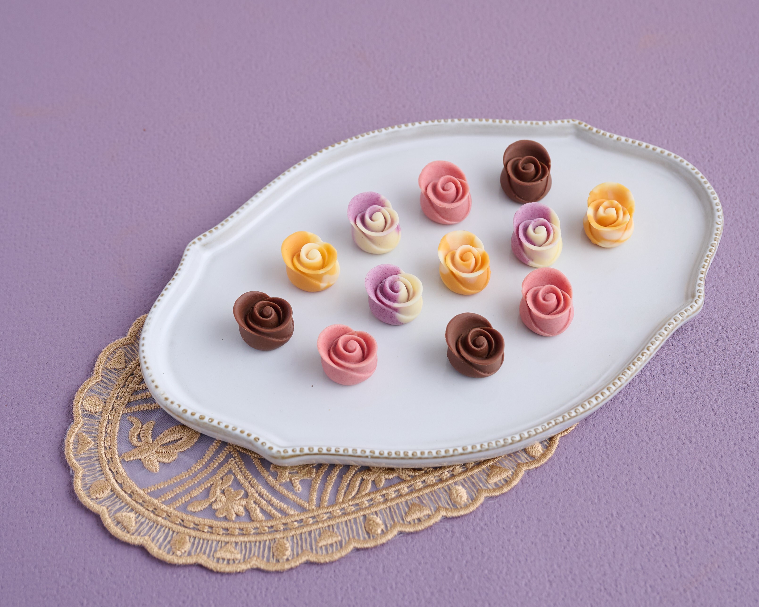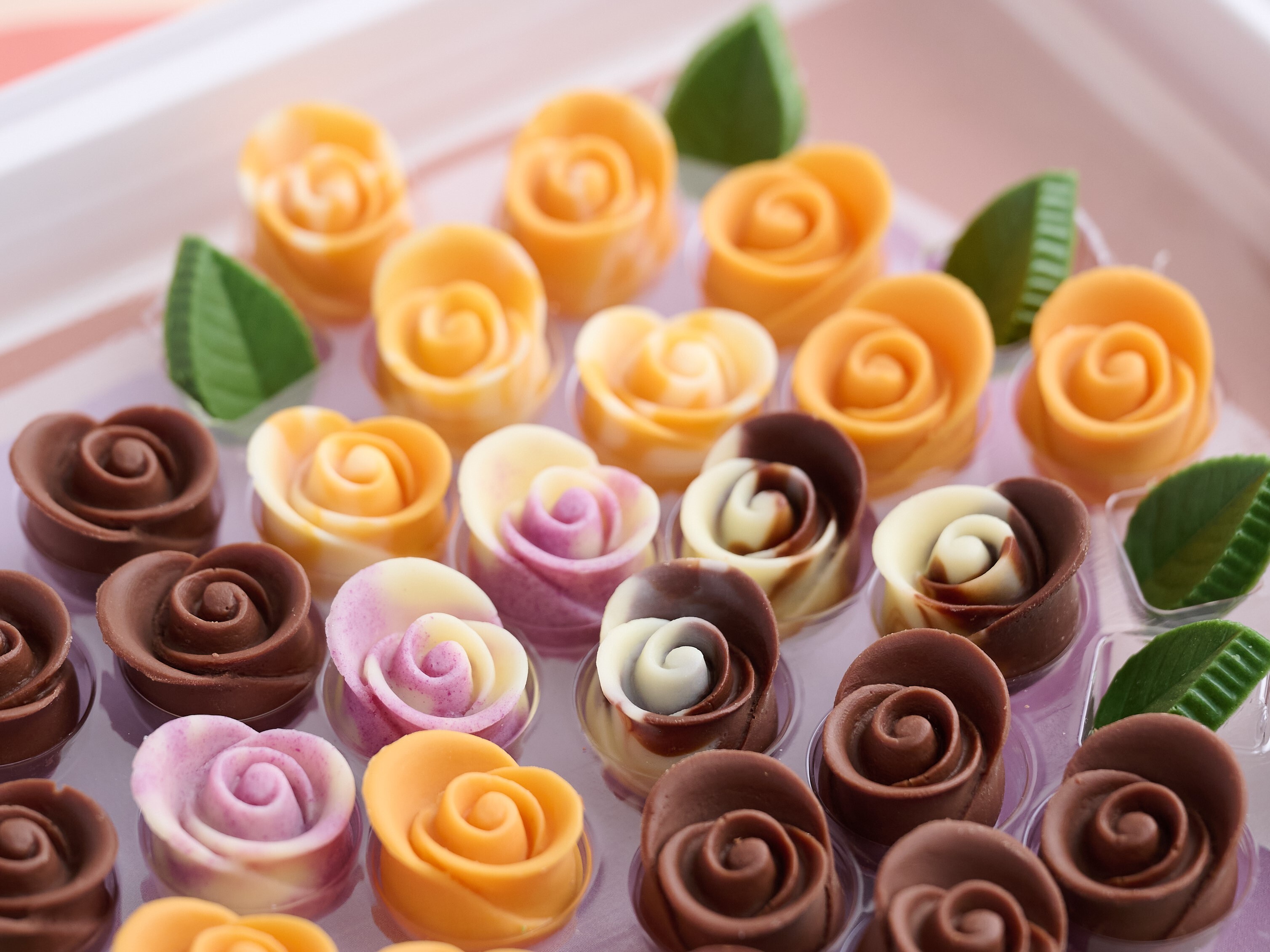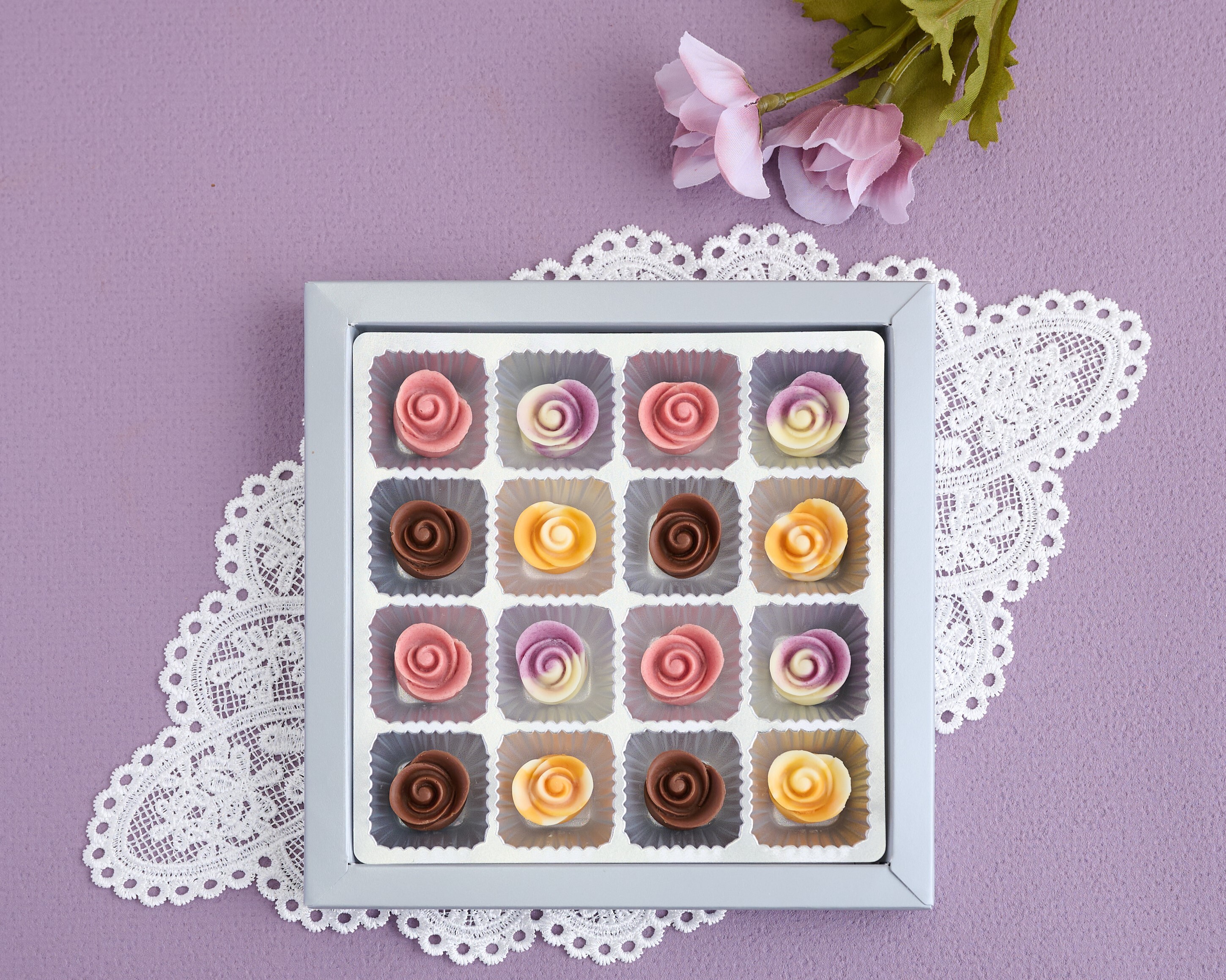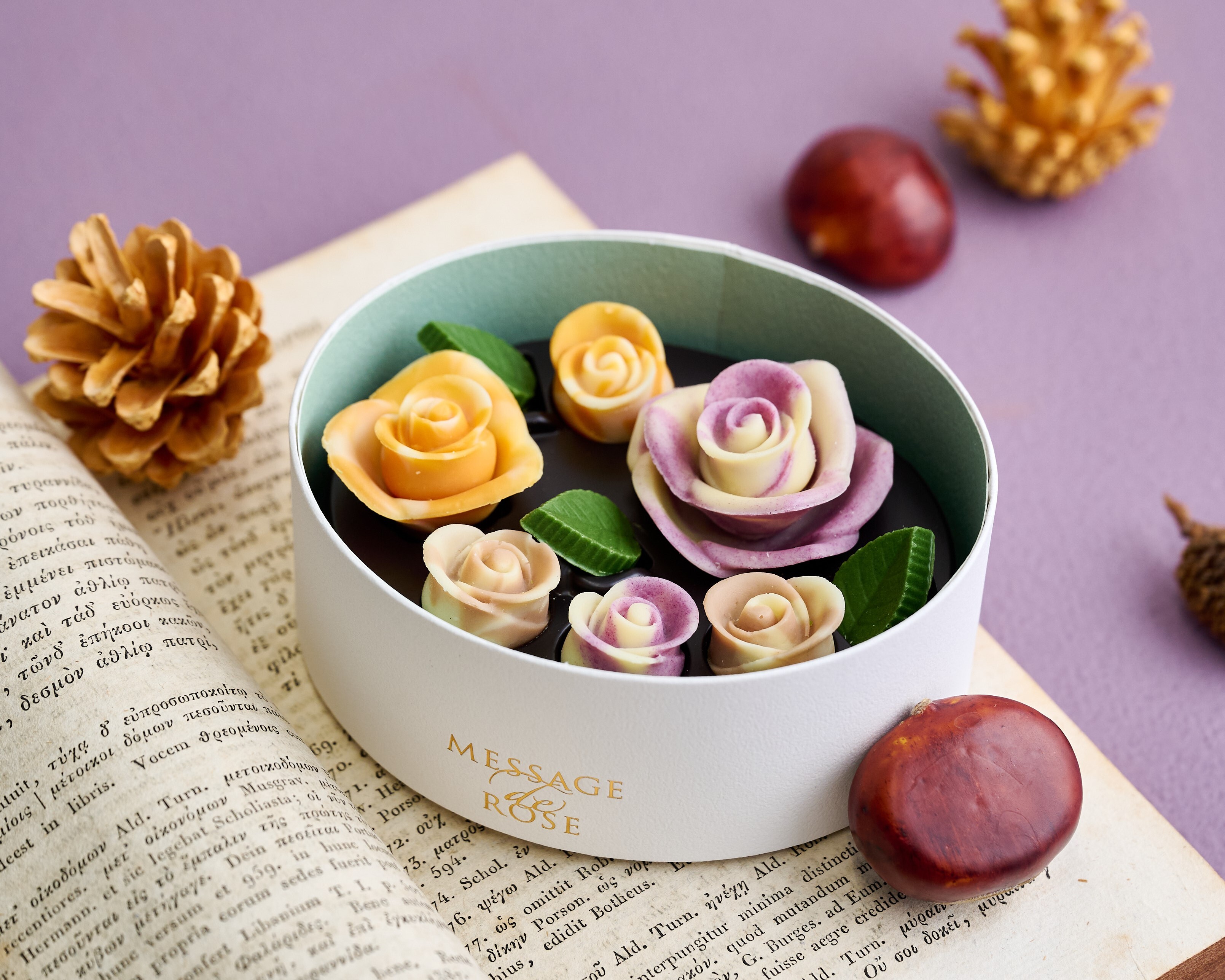 彩り豊かな薔薇のつぼみを散りばめたショコラボックス。秋の訪れを感じさせる紫芋とみかんのマーブル、甘酸っぱいイチゴとまろやかなミルクの4つの味わいを楽しめます。秋の夜長にゆったりと読書などを楽しみながら、彩り豊かなショコラをつまむ、贅沢なひとときをお過ごしください。