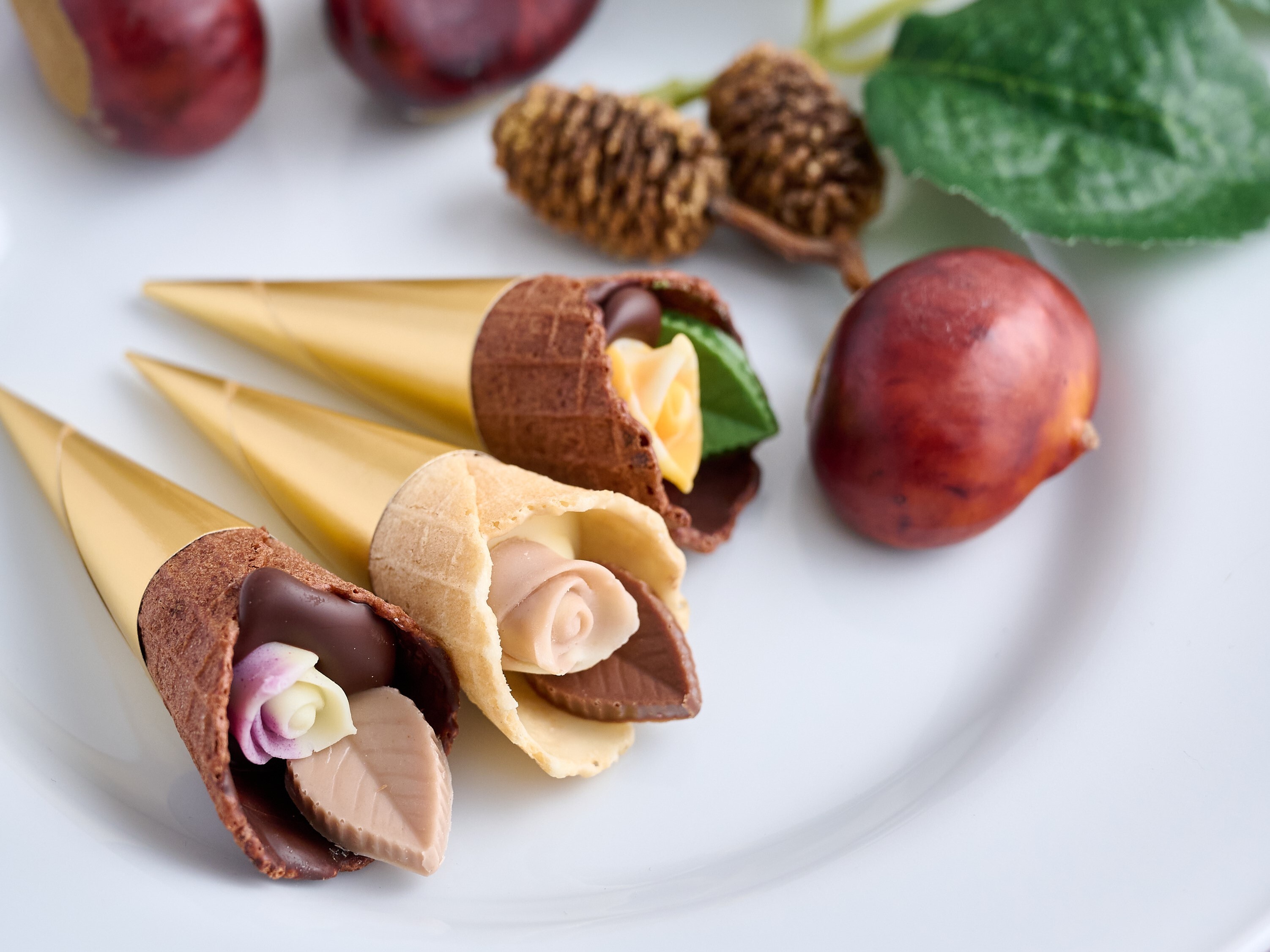 「TOKYOコーン・フルーリ」が秋仕様の3本パッケージで新登場。バニラコーンにはマロンマーブルのつぼみとミルクのリーフ、チョココーンにはみかんマーブルのつぼみと抹茶のリーフ、紫芋マーブルのつぼみとマロンのリーフをトッピングしました。それぞれ異なる秋の味覚が楽しめる、一口サイズの可愛い花束ショコラです。