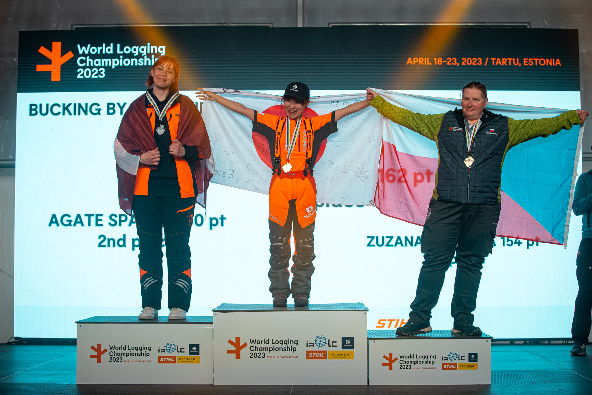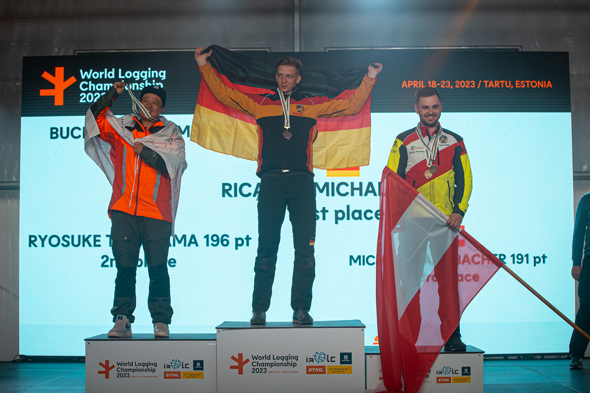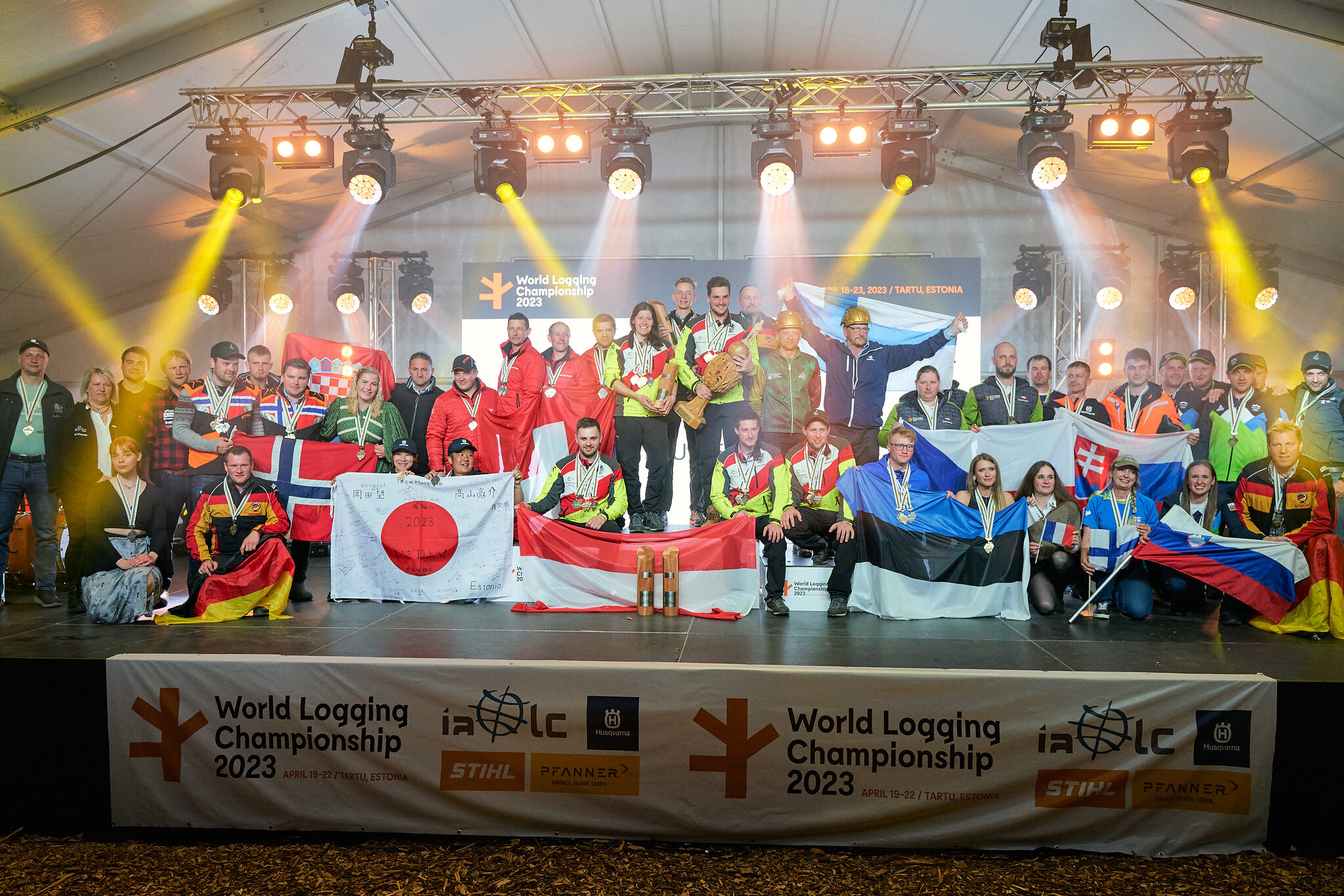 WLCとは、50年以上の歴史を持つ由緒あるチェンソー技術の世界大会であり、2023年4月19日~22日にエストニアのタルトゥにて第34回大会が開催されました。本大会には、ヨーロッパを中心に20カ国、合計93名の選手が参加し、5種目(伐倒、ソーチェン着脱、丸太合せ輪切り、接地丸太輪切り、枝払い)の個人種目およびリレー種目の団体戦にて、熱い戦いが繰り広げられました。