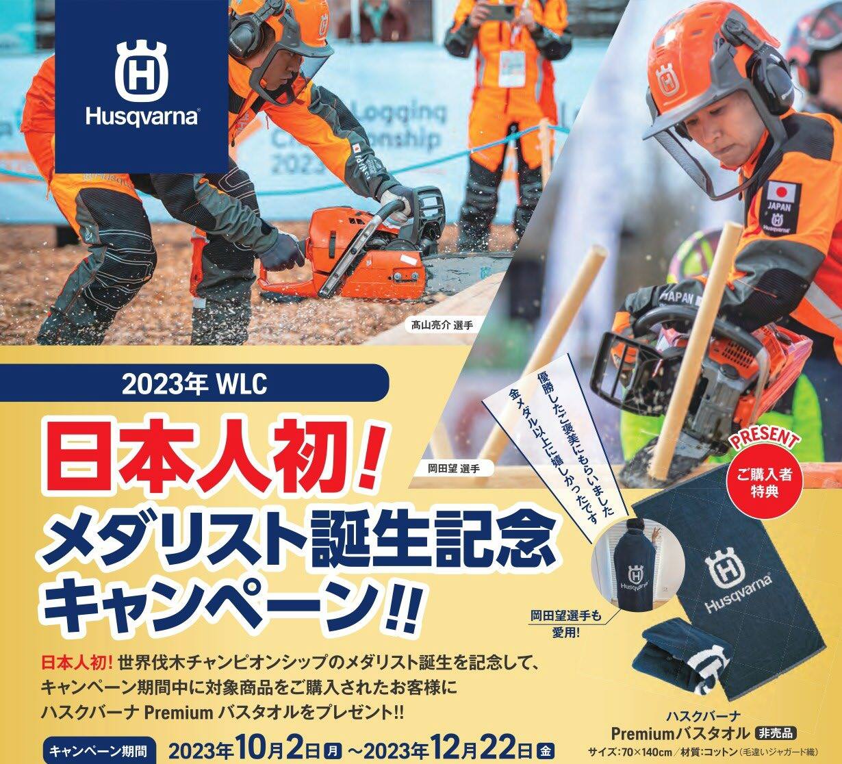 ハスクバーナ・ゼノア株式会社(本社:埼玉県川越市、代表取締役:パウリーン・ニルソン)は、2023年10月2日(月)より、日本人初となる世界伐木チャンピオンシップ(WLC)のメダリスト誕生を記念したキャンペーンを展開します。