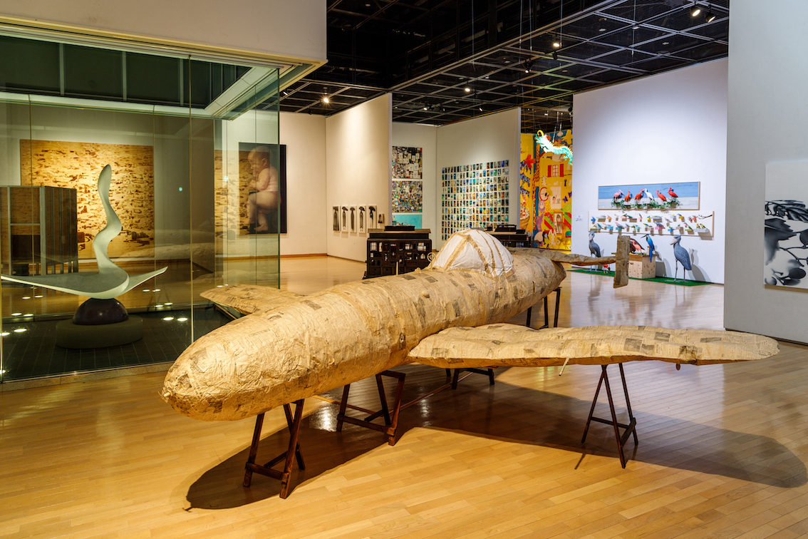 タイトルの「OHKA」とは、第二次大戦中に特攻専用のロケットエンジンによる航空機として開発された「桜花」である。作者はその姿形を実物大で再現する。しかも、その表面は昭和19~20年に発行された新聞紙で覆われている。そしてさらに、空気で膨らませているのは、やはり戦時中に制作された「気球爆弾」を意識しているのである。若者を死に至らしめるためにだけ開発された兵器。それを、ある意味滑稽な造形として表したこの作品は、観る者に揺さぶりをかけ、遠い過去の記憶を呼び覚ます装置となっている。(山下裕二)