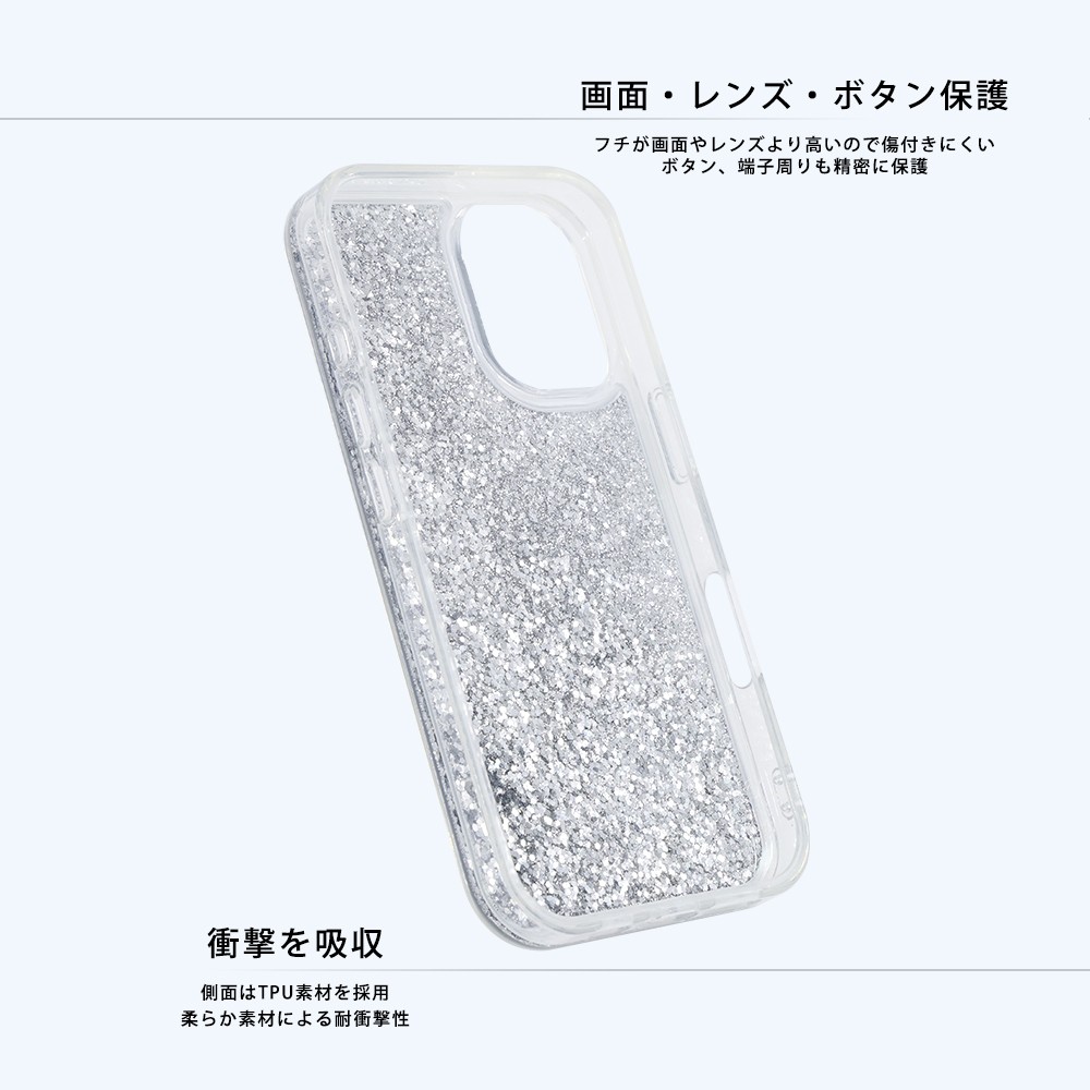 ボタンや端子周りまで精密に保護。安全性の高いミネラルオイルでスノードームのようにキラキララメが流れるスマホケース。