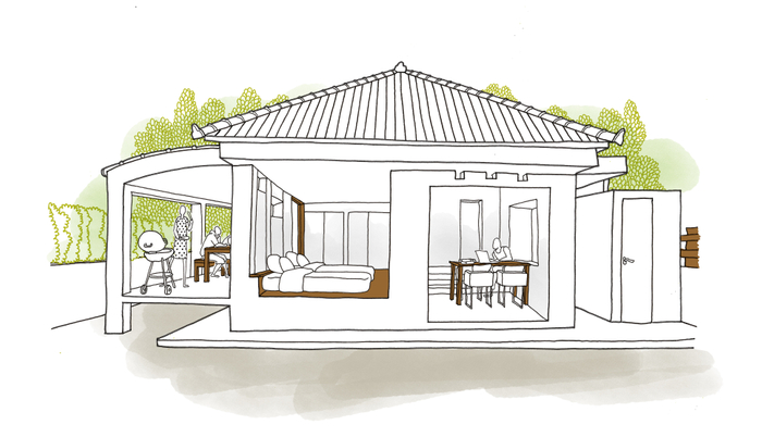 宿泊棟のうち3棟は空き家をフルリノベーションし、1棟は沖縄在来のコンクリートブロック工法で新築。宿泊者は、かまど・家庭菜園・土間・BBQテラス・露天風呂・縁側などを備えた1棟(※)を1グループで貸し切り、集落に古くからある自然と地続きの暮らしを体験します。※棟ごとに設備の有無は異なります。