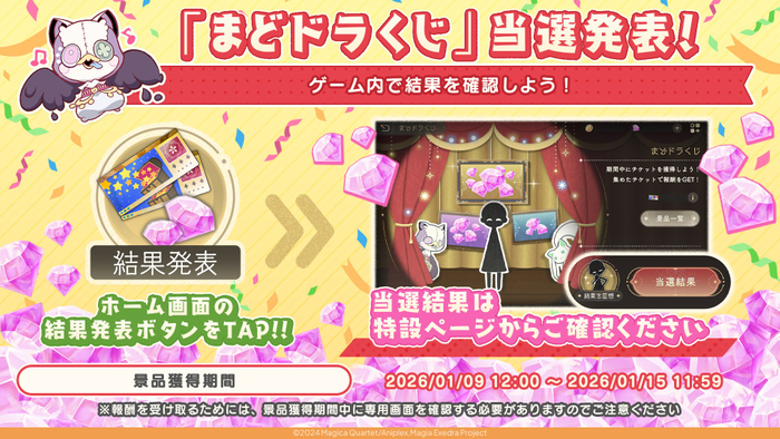 2026年1月8日(木)20時より放送したエクセドラ通信、及びゲーム内にて年末年始に開催していた「まどドラくじ」の結果発表をおこないました。まどドラくじは、特等当選でマギカストーン30,000個、参加賞でも抽選チケット1枚につきマギカストーン100個獲得いただけます。