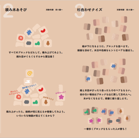 「木のおもちゃ」には、おもちゃができるまでの過程と遊び方が記載されている冊子が同封されます。材料となる木を伐採して木材に加工し、おもちゃになる過程を優しい言葉で説明することで地域への愛着と木のおもちゃへの親しみを親子で育む工夫がなされています。