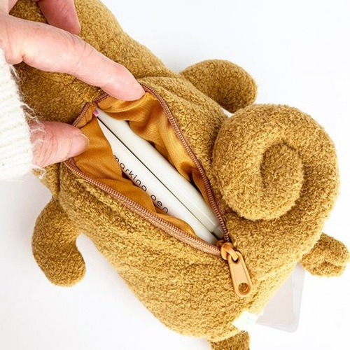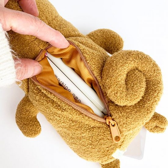 前面はぬいぐるみにしか見えませんね~♪マスコット感覚で携帯できる、ペンポーチですね。もちろん、小物入れとしていろいろな物を入れていただけますよ。