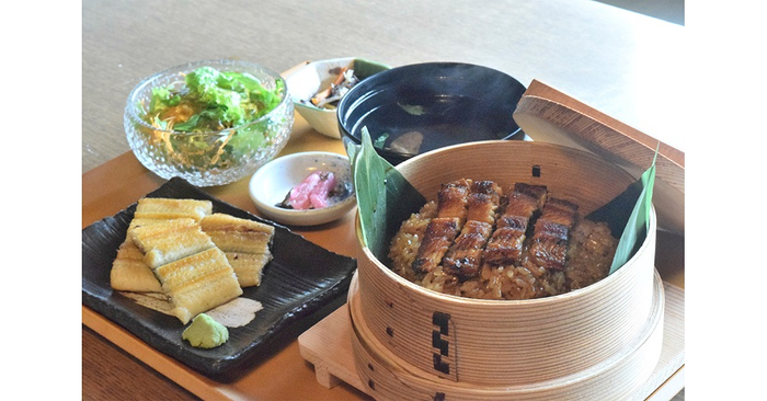 木の器がおこわのもっちりとした食感と笹の風味を閉じ込めます。開けた瞬間の笹の香りが食欲をそそります。黒糖を使った自家製タレがしみたご飯と山椒のピリッときいたアクセントが美味しさをさらに引き立てます。口直しに鰻の白焼きもついて、贅沢にうなぎの食べ比べも味わえるお膳になっております。