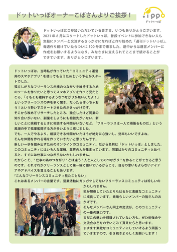 無料オープンコミュニティ「.ippo(ドットいっぽ)」のコミュニティ内での情報共有の為にコミュニティ内で配信する『週刊ドットいっぽ』が4/7に100号を迎えました。(運営:合同会社KBC(神奈川県川崎市 代表社員 小林慶志郎))
