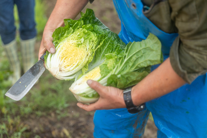 春キャベツは、収穫のコツを教えていただきながら、株元に収穫包丁を入れ、芯を切って収穫します。半年かけて大切に育てられ、丸々とした春キャベツはハリと重みがあり、生で食べてもえぐみがなく甘みが感じられました。