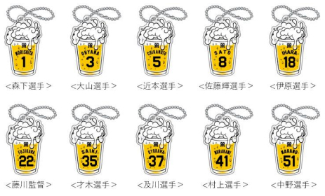開催期間中、阪神甲子園球場でアルコール商品(※)をお買上げの方に、1杯につき「引換補助券」を1枚お渡しし、5枚集めた方にもれなく「阪神タイガース監督・選手ビール型アクリルキーホルダー(全10種)」を1つプレゼントします。