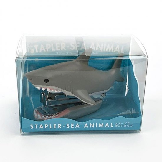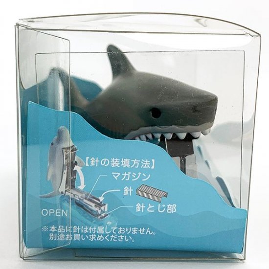 最初にご紹介するのは、なんでサメ!?ホッチキスです。海を表現したパッケージがサメの迫力をより一層出していますね♪