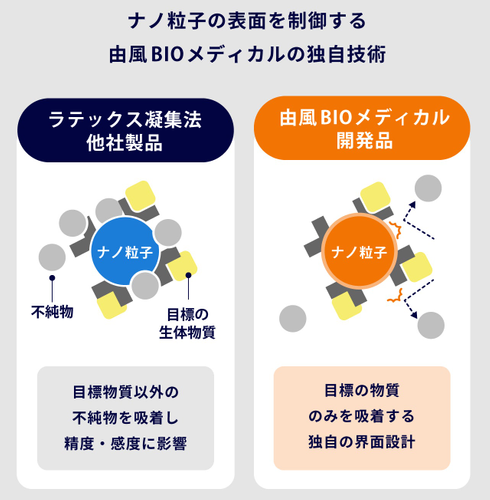 由風BIOメディカルの主力事業は、ナノバイオロジー領域の独自技術を活用した迅速かつ低コストな高感度体外診断薬の研究開発です。現在、体外診断においては「ELISA(イライザ)法」や「ラテックス凝集法」といった手段がありますが、由風BIOメディカルの開発品では、ELISA法の課題であった診断時間が4分の1に短縮され、ラテックス凝集法の課題であった診断感度が5倍に向上したという結果が、自社実験により得られました。