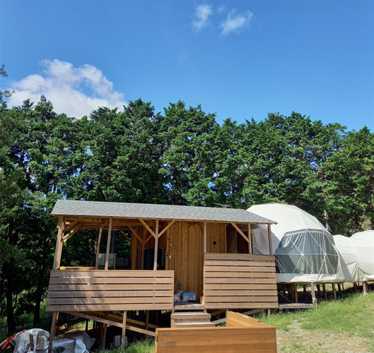 おしゃれな貸別荘スタイルや、テントの上に貸切のツリ-ハウスがある