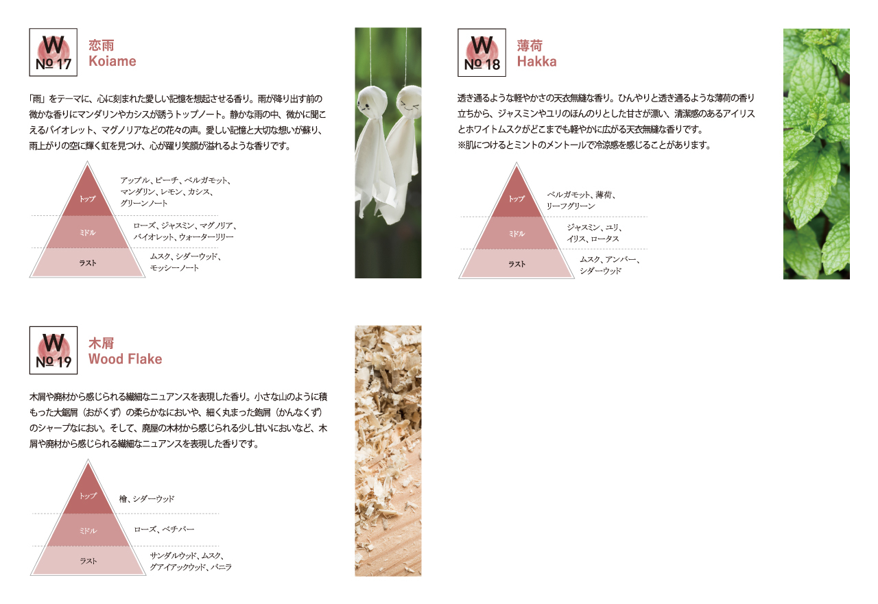 “和の香り”をテーマにした香水ブランド。川端康成の小説“眠れる美女”をモチーフにした「和肌」や「力士」のびんつけ油の香り、「ラムネ」や「紙せっけん」の香りなど、ユニークな和の香りをこれまでに発売してきました。