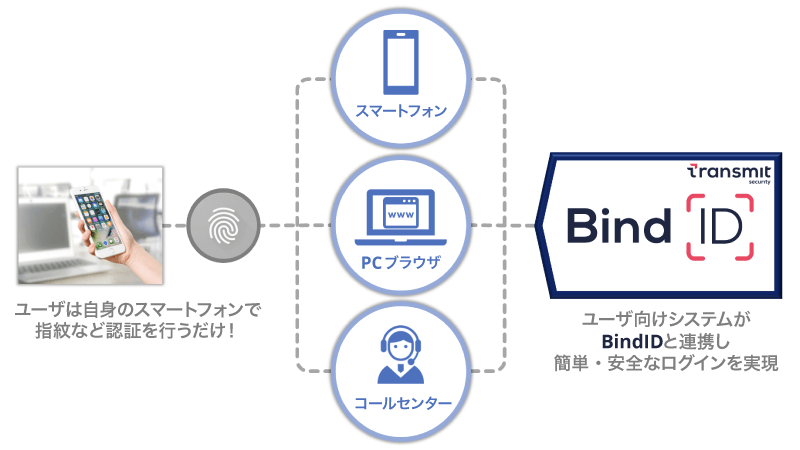 Transmit Securityの提供する「BindID」は、サービス利用者が保有するスマートフォンをユーザ固有の認証器とすることで、ユーザID・パスワードを入力することなく強固な認証セキュリティを実現することのできる認証ソリューションです。サービスの利用者は、自分のスマートフォンをアカウント認証器として登録することで、ユーザID・パスワードの入力を行うことなく、安全かつ簡単にログインできます。利用者はユーザID・パスワードを管理・入力する手間から解放され、サービス提供事業者は強固な認証セキュリティによって不正ログイン被害を未然に防止することができるため、高いレベルのユーザビリティとセキュリティの両立を実現します。認証を強化しつつユーザビリティを下げないソリューションなので、ECサイトや地方金融機関のインターネットバンキング、本人確認が必要なチャットボットなど、認証が必要な様々な場面での活用が期待されます。