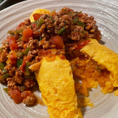 中のライスは500円でもただのケチャップライスではありません。ごろごろの鶏肉が入ったチキンライス。もうそれだけでも美味い逸品です。