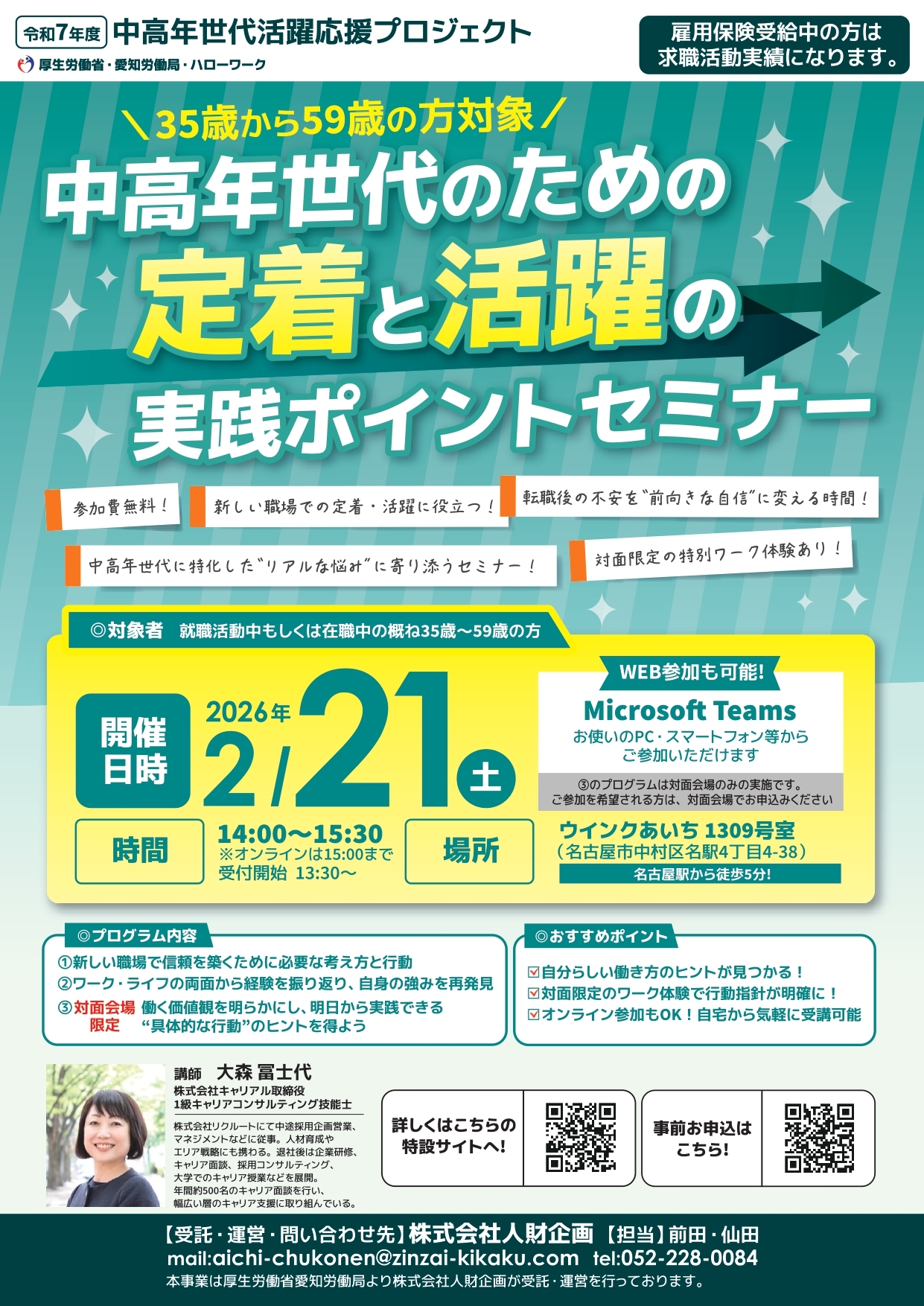 さらに今回は、同プロジェクトの一環として、2月21日(土)に「中高年世代のための定着と活躍の実践ポイントセミナー」を名古屋市内で開催し、中高年世代の就職後のキャリア形成も含め支援します。