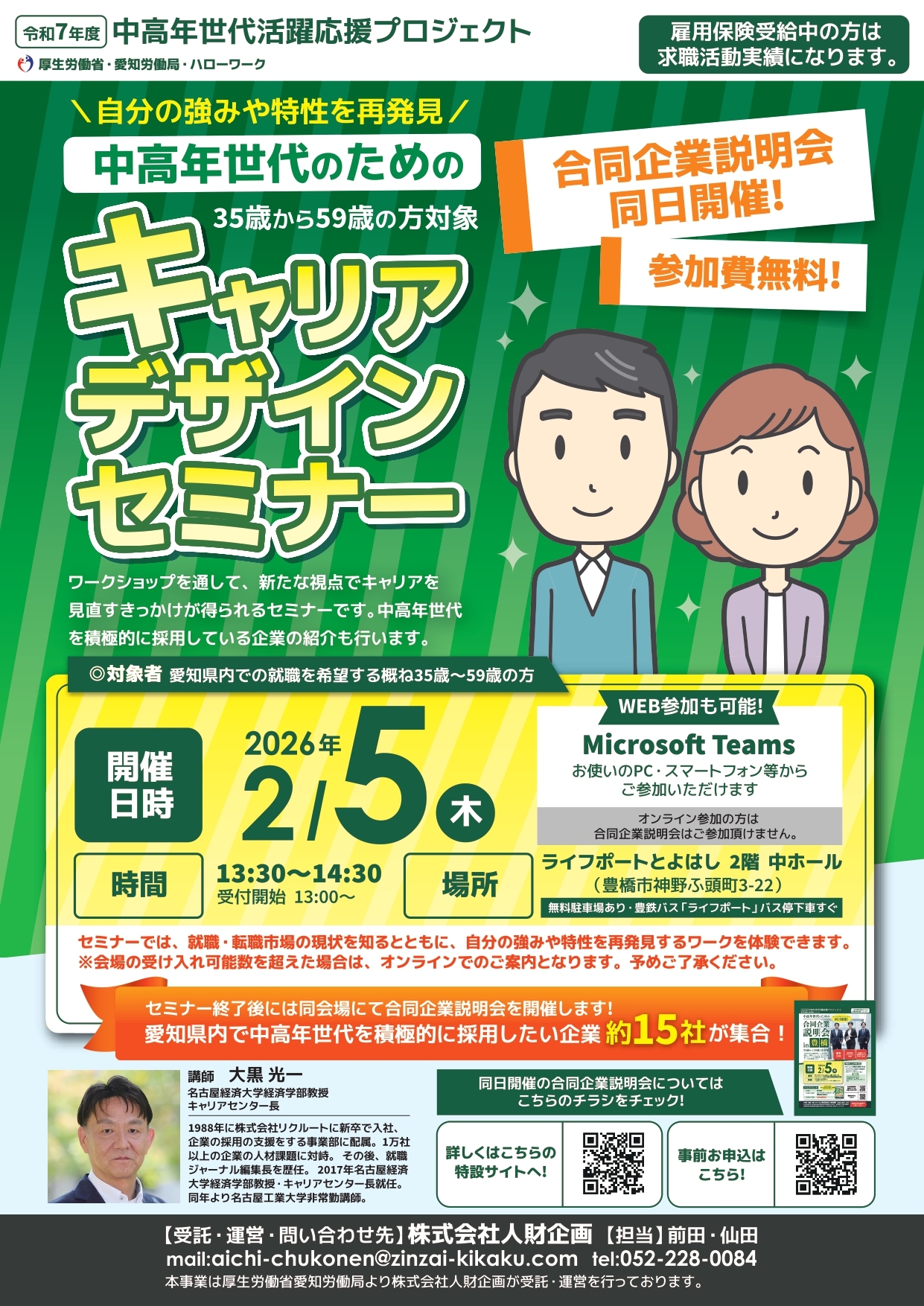株式会社人財企画は、「令和7年度中高年世代活躍応援プロジェクト」(厚生労働省 愛知労働局)の受託事業として、2026年2月5日(木)、豊橋市・ライフポートとよはしにて「中高年世代のためのキャリアデザインセミナー」と「中高年世代のための合同企業説明会 in 豊橋」を同日開催いたします。