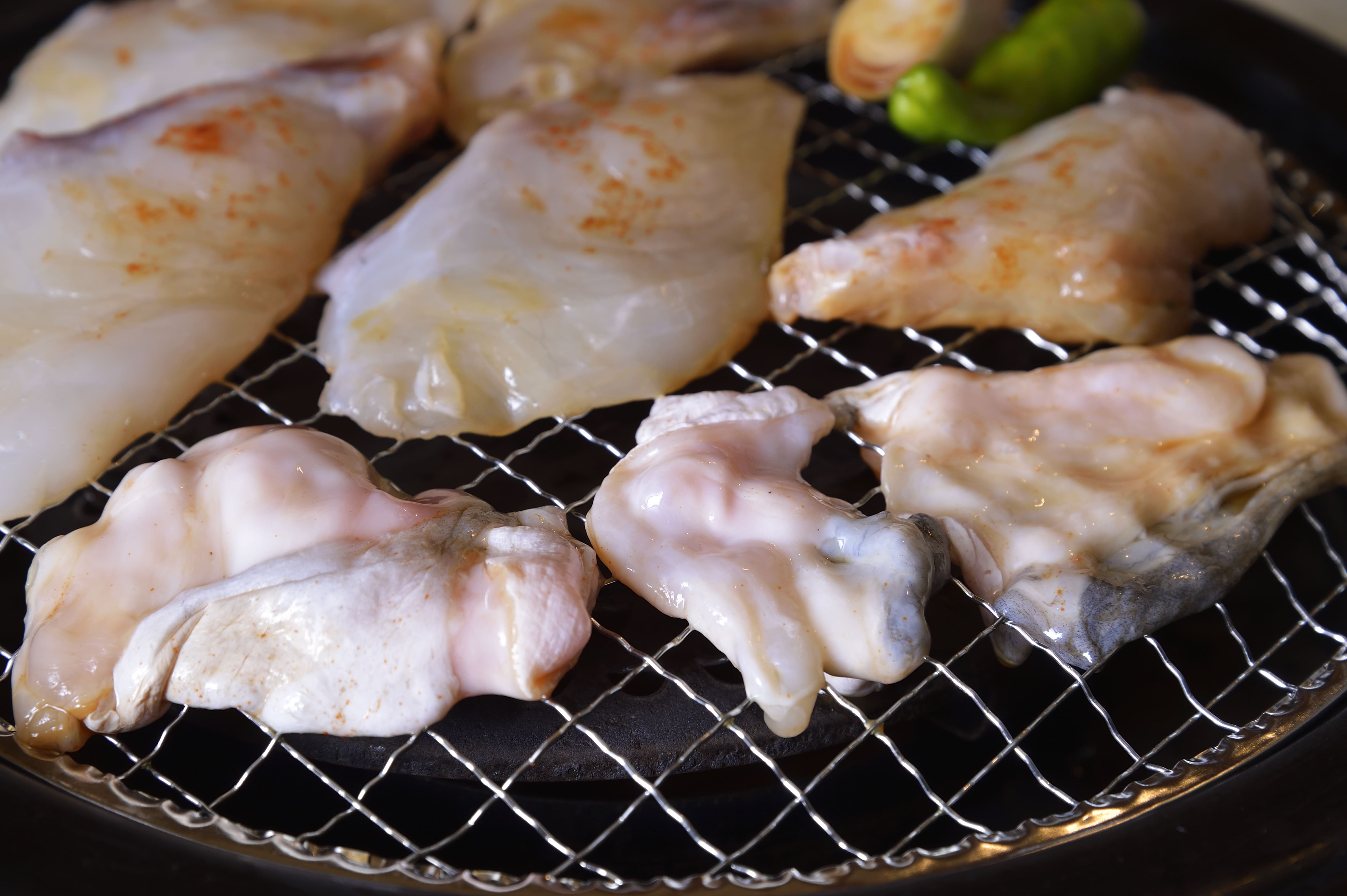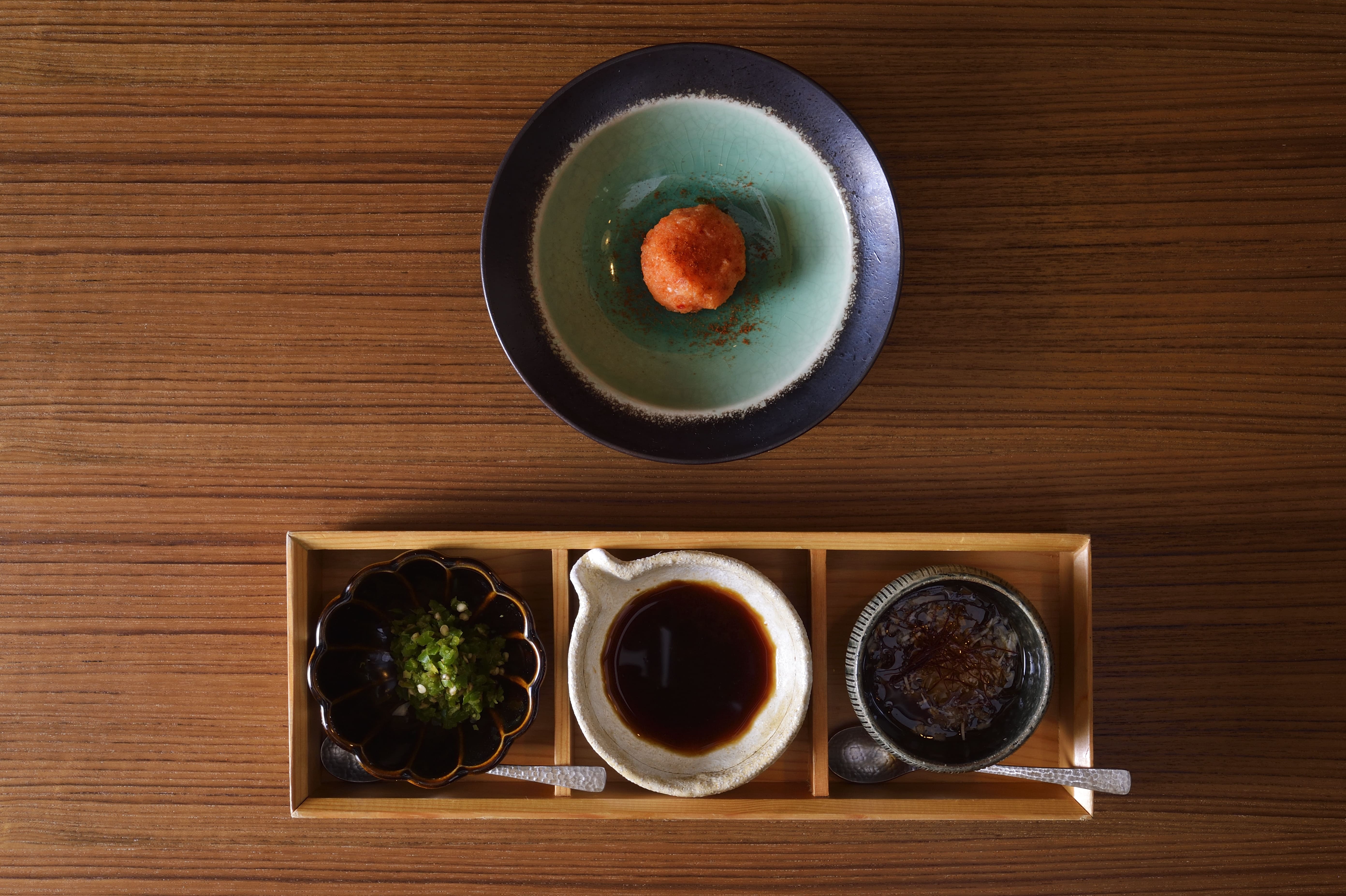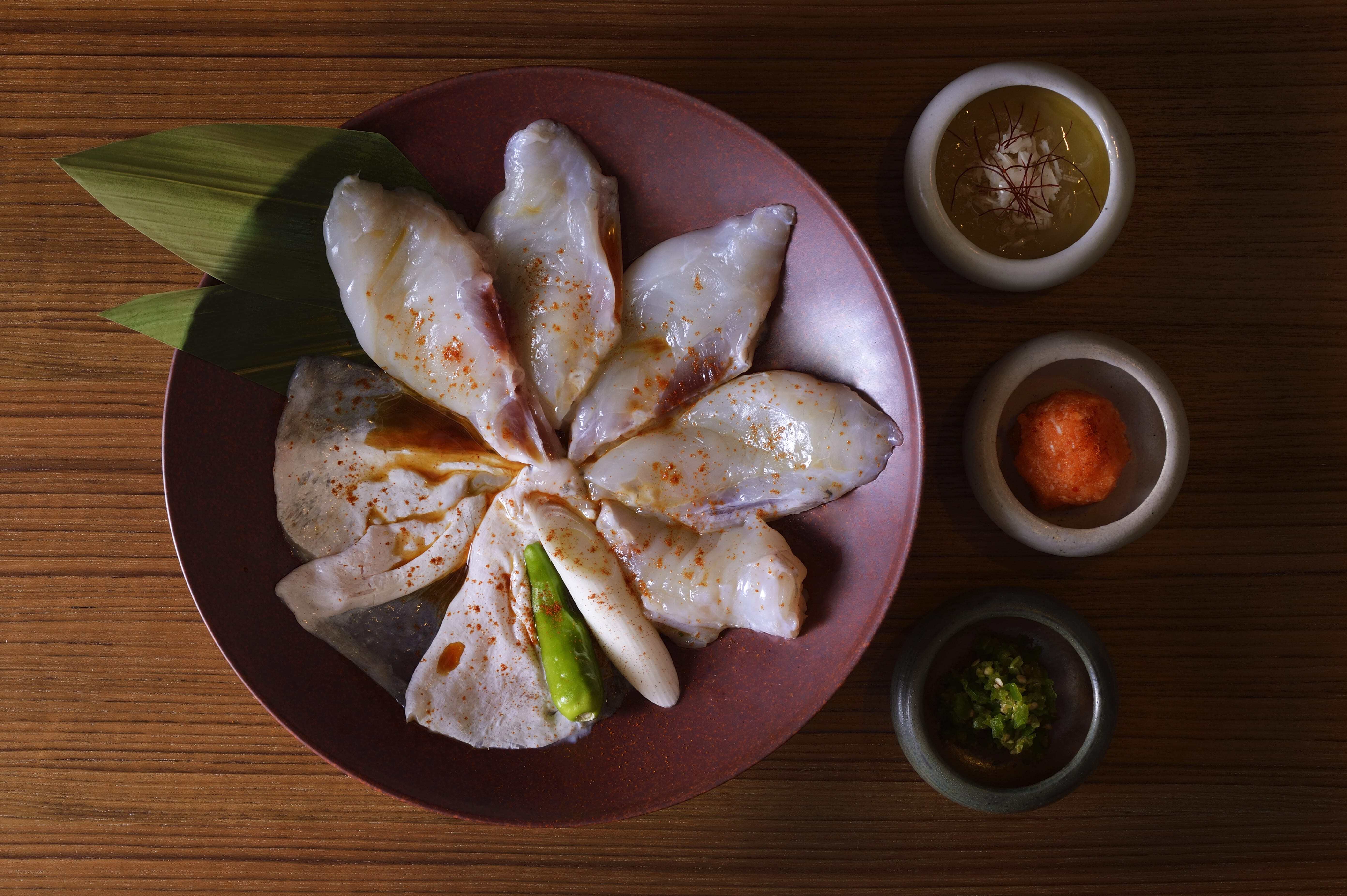 関門海が誇る独自の熟成技術を用いて、当店では年間を通じて最高品質の焼きふぐをご賞味いただけます。なかでも、焼きふぐのあら身は風味・食感を存分にご堪能いただけるよう、大ぶりで分厚く、食べ応えのあるカットでご提供。口いっぱいに頬張ればふぐの旨味が溢れ、焼きふぐならではの醤油の香ばしさが鼻に抜けます。お好みの薬味(ポン酢・塩ニンニク・赤おろし・韓国の唐辛子プルコッチ)と合わせて、異なる味わいをお楽しみいただけます。