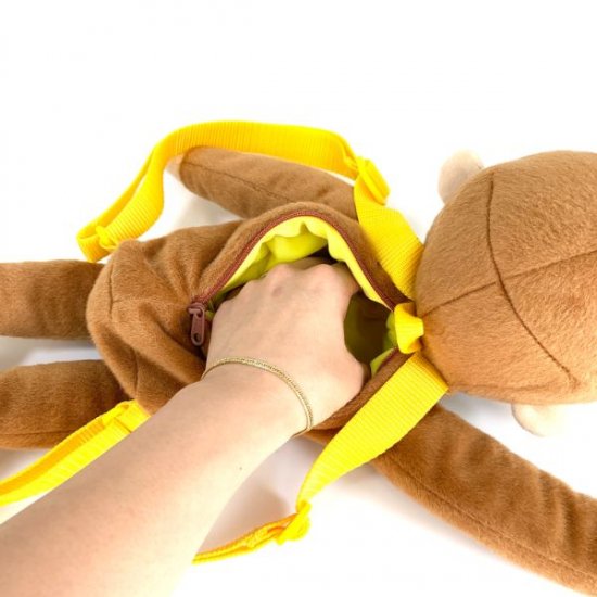 まずはぬいぐるみリュック、もはやぬいぐるみのリュックです。バナナ色のベルトが取り付けられており背負えばいつでもジョージと一緒♪という代物。