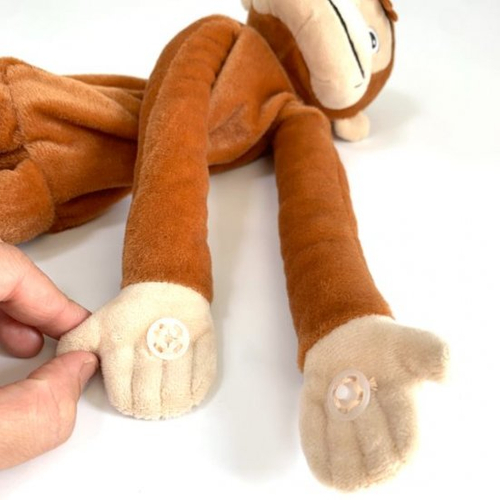 両手にはボタンが付いていて、このようにロープにぶら下げて遊べます。バッグやキャリケースにもひっかけられそうですね♪