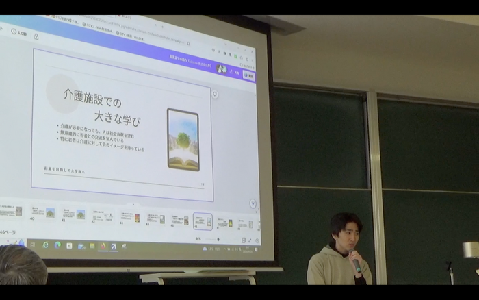 同世代に近い起業家の等身大の体験談に基づく講義が、学生たちによい刺激と考える機会の提供をもたらし、超高齢社会という身近で切実な社会課題に対する具体的なアプローチを学ぶことで、医療・福祉分野における新しいビジネスモデルの可能性を実感できます。