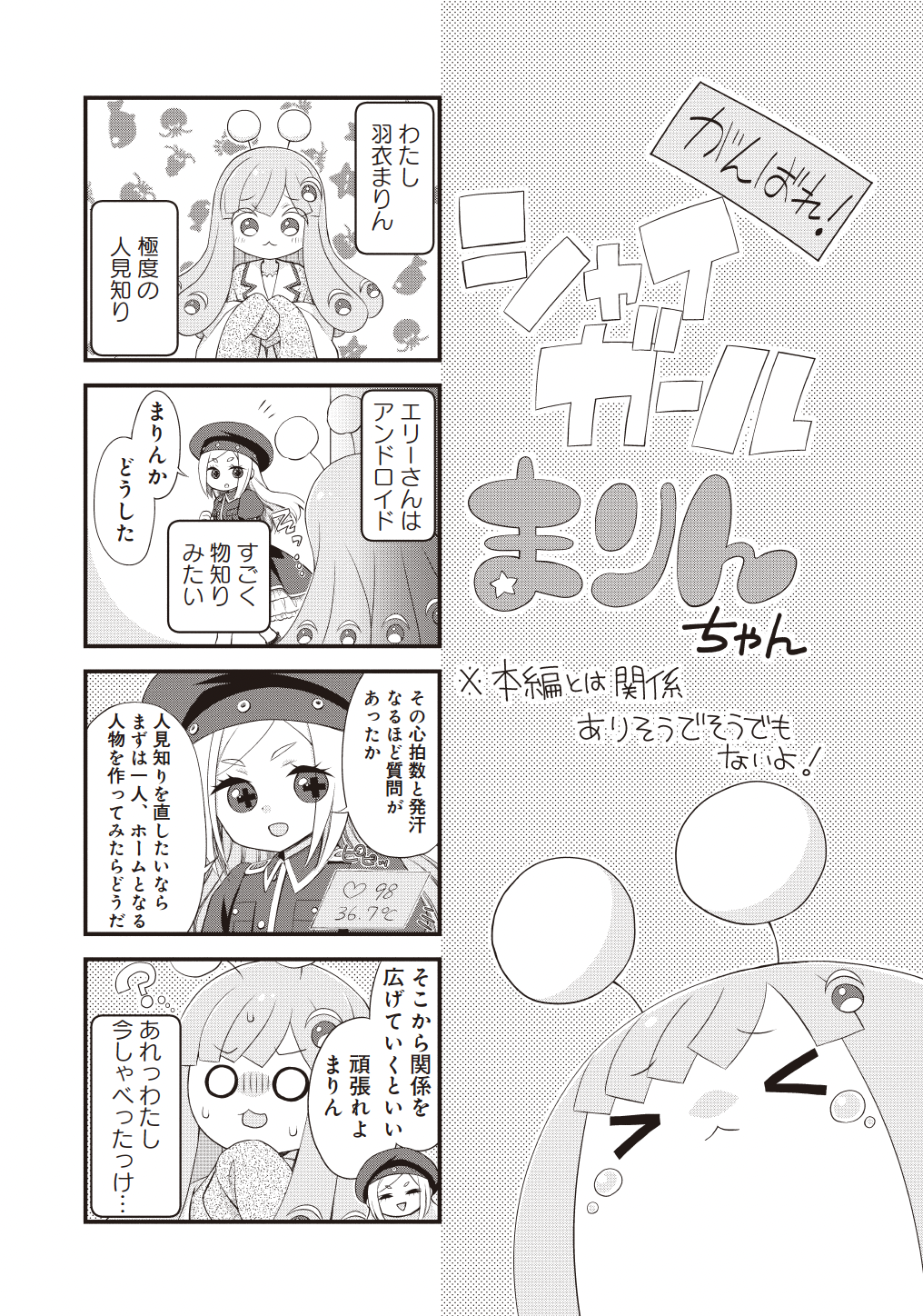 「現在地は、地球から1兆5千億キロです」と船長代理アンドロイドのチェルシーさんに告げられた青木ヶ原女学院の7人。修学旅行で訪れた宇宙博で、展示中の“キャロットエンデバー号”内を見学していたはずの彼女たちは、いま、宇宙を、絶賛漂流中。なし崩し的に幕を開けた“宇宙少女漂流記”。その影には巨大な計画がうごめいているとかいないとか。単行本には描きおろし漫画「がんばれ!シャイガール まりんちゃん」収録。そして待望の映像化企画も進行中!